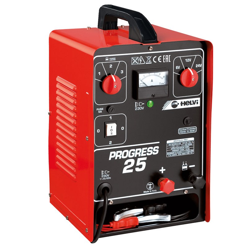 Helvi Progress 25 has a power of 620 W and supports battery voltages from 6 to 24V , with a maximum current of 25 A. Helvi Progress 35B, more powerful 1830 W , manages batteries up to 48V with a maximum current of 38 A. Both include voltage/current selectors, ammeter, automatic thermal protection and light indicators on the charge status.