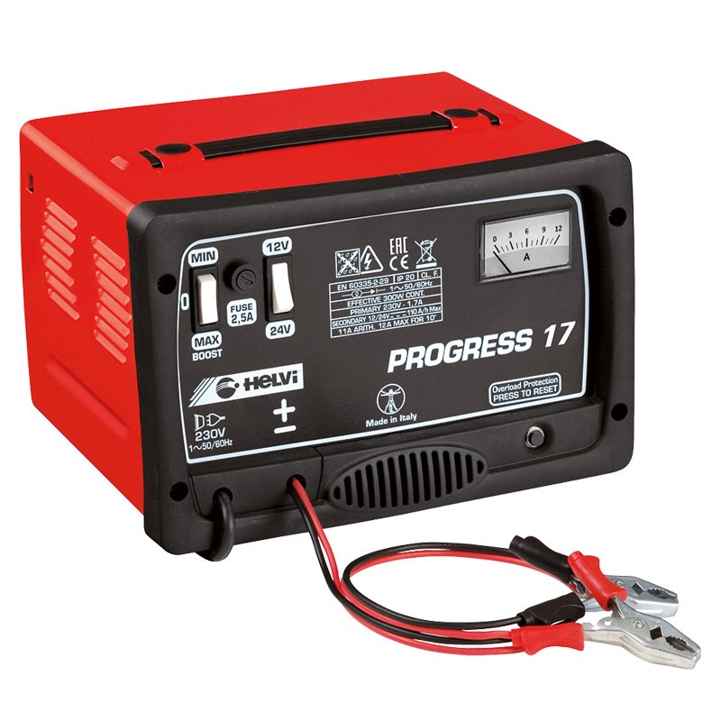 Helvi Progress 17 cod. 99000068 is a semi-professional battery charger designed for the efficient and safe charging of 12 and 24 Volt lead-acid batteries . Thanks to its 300 W power and a charging current of up to 8.5 A , this model offers reliable performance for the automotive, agricultural and domestic sectors . It is equipped with voltage and current selectors, an integrated ammeter, automatic thermal protection against overload and a polarity reversal system, which guarantee maximum safety during use.