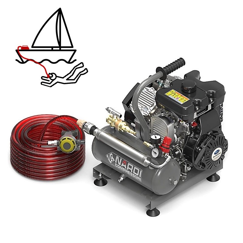 The Nardi Extreme Hookah 5G 60 and Nardi Extreme Hookah 5G 70 models with 7 L tank , 2 cylinders, 10 bar max pressure , this breathing air compressor is petrol-powered .