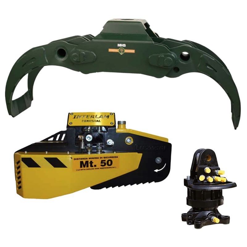 MHS Complete, pre-assembled forestry kit consisting of a TMR 1400 forestry grapple , an IT 500 CTH hydraulic chainsaw , and a hydraulic rotator . Designed for professional felling, sectioning, and log handling, it is compatible with machines weighing 4 to 7 tons . Supplied with an integrated plate and hydraulic system, ready for assembly.