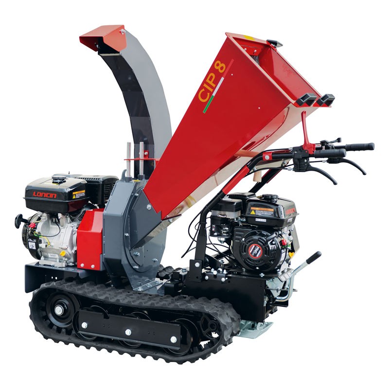 The FBC CIP.8 DU chipper is available in two power versions , both equipped with single-cylinder 4-stroke engines for both the chipping system and the self-propelled part. The version with Honda engines mounts an 11.7 HP (8.7 kW) GX390 for the cutting system and a 4.8 HP (3.6 kW) GX160 for the tracked power barrow. Alternatively, the version with Loncin engines is equipped with an 11 HP (8.2 kW) G390F for the chipper and a 5.6 HP (4.2 kW) G200F for the traction system. Both configurations offer high reliability , continuity of work and adequate power even on difficult or sloping terrain .