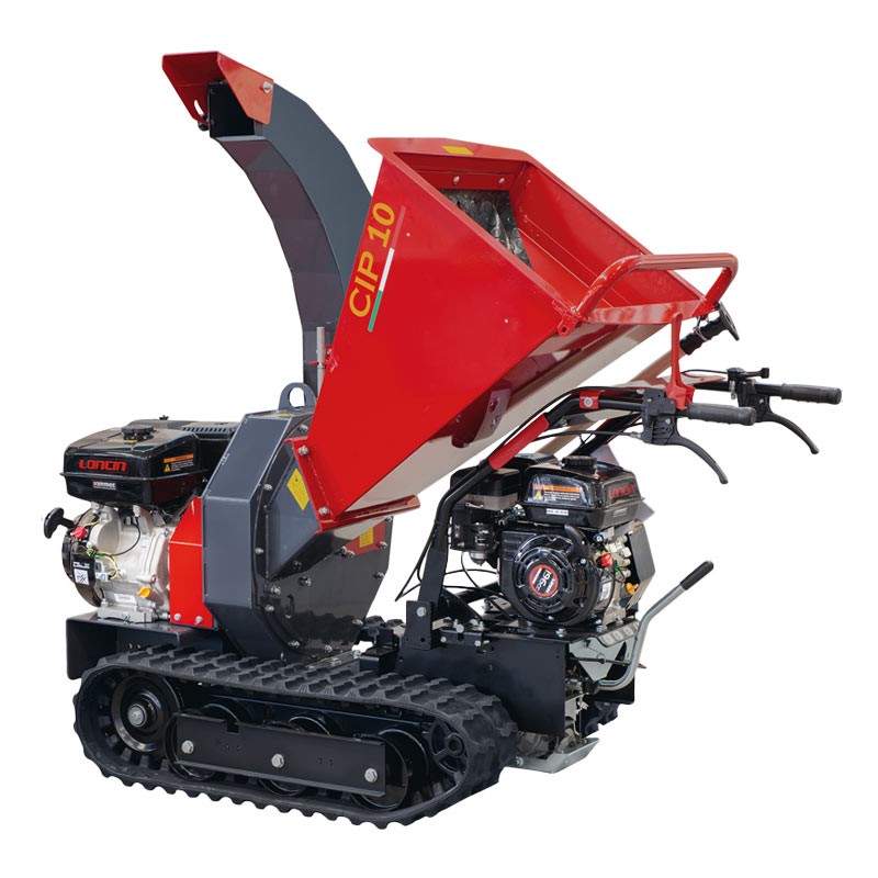 The FBC CIP.10 DU chipper is available in two power versions , both equipped with single-cylinder 4-stroke engines for both the chipping system and the self-propelled part. The version with Honda engines mounts an 11.7 HP (8.7 kW) GX390 for the cutting system and a 4.8 HP (3.6 kW) GX160 for the tracked power barrow. Alternatively, the version with Loncin engines is equipped with an 11 HP (8.2 kW) G390F for the chipper and a 5.6 HP (4.2 kW) G200F for the traction system. Both configurations offer high reliability , continuity of work and adequate power even on difficult or sloping terrain .