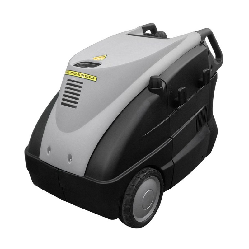 Steam generator for cleaning large surfaces and car exteriors without the use of detergents. It features a diesel burner for an exceptional steam output of 47.5 kg/h. Ideal for use with two operators.
