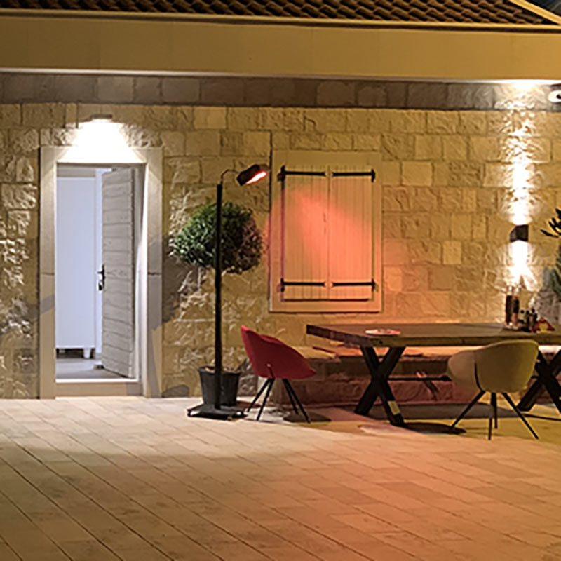 Installation is recommended at a height of 2.50 to 2.80 m to ensure uniform heat distribution. A minimum distance between fixtures of 2.50 to 2.80 m is recommended to optimize coverage. The lamp offers several mounting options: wall, ceiling or mobile stand , thus adapting to various environments, indoors and outdoors.