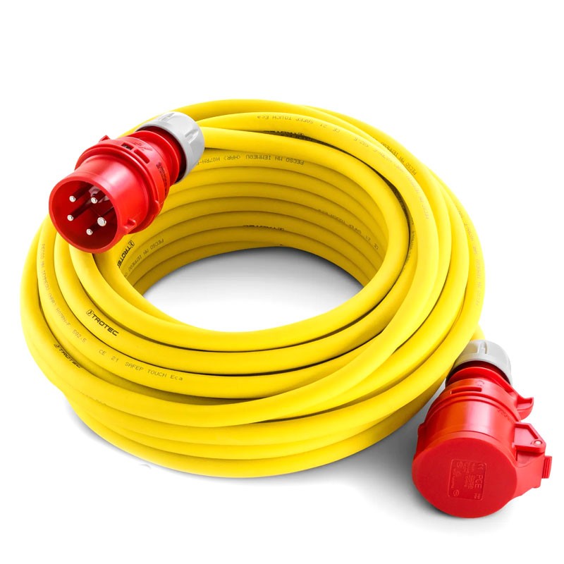 From a technical standpoint, the Trotec professional extension cable is powered by a three-phase 400V supply, with a nominal current of 32A . The cable, with a 6 mm² cross-section, is a 5-core H07RN-F type and guarantees IP44 protection, making it suitable for both indoor installations and outdoor use in harsh weather conditions. The yellow neoprene sheath is resistant to temperatures between -25°C and +60°C , oils, acids, UV rays, and ozone, maintaining flexibility even in critical conditions.