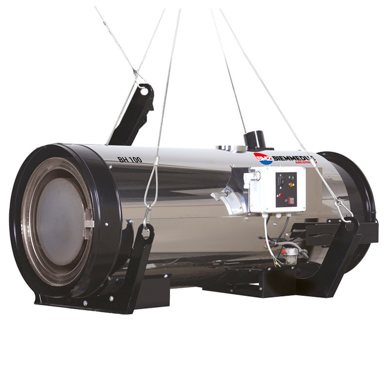 Biemmedue BH 100 is a Hanging Indirect Combustion Hot Air Generator available in Diesel, Methane or LPG versions. Thanks to its high air flow rate of 8500 m³/h it is ideal for use in large environments such as industries, sheds or warehouses.