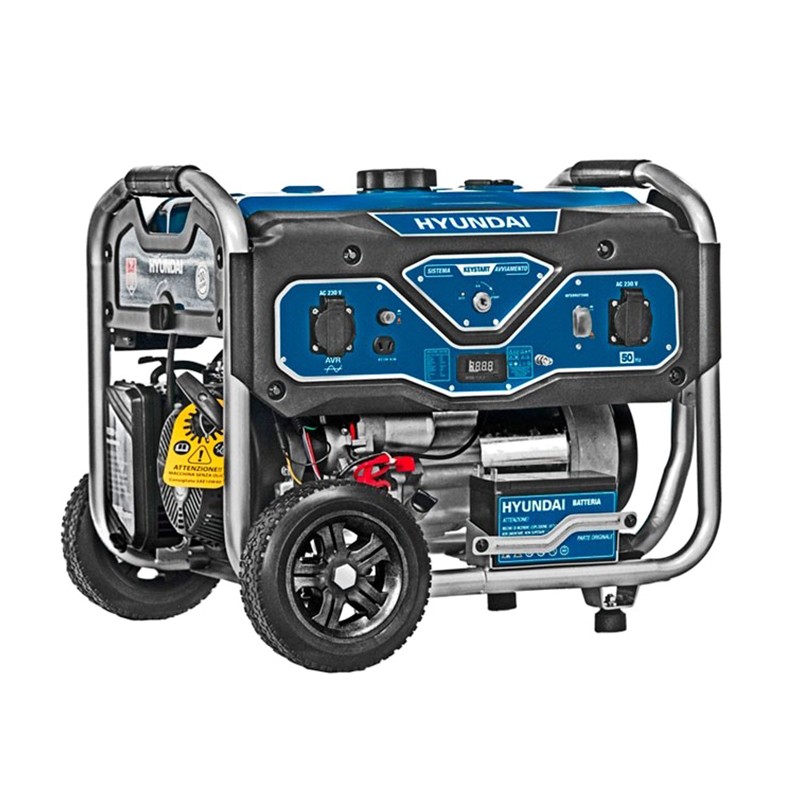 The Hyundai 65000 LS3050E is a gasoline generator equipped with a reliable 6.5 HP 4-stroke Euro 5 engine, ensuring low fuel consumption and high reliability. The structure is extremely robust thanks to oversized tubing and is equipped with large rubber wheels and a practical handle for easy movement; the 15-liter tank ensures excellent autonomy.