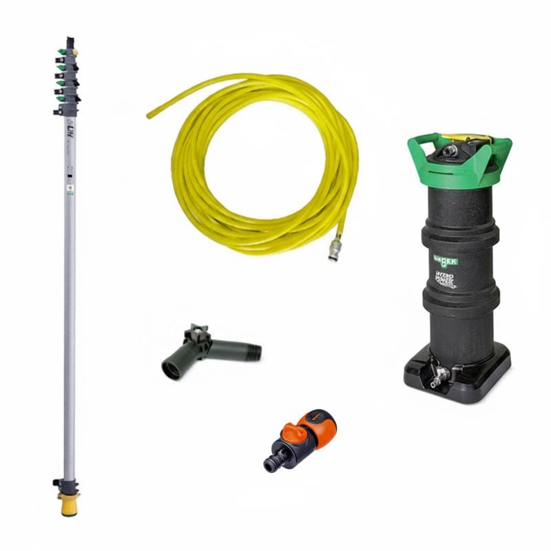 Modular and telescopic system designed to ensure structural rigidity and lightweight construction. For operators who require precision and safety when washing at height. It features yellow markers to prevent accidental removal and a protective end cap with a side hose outlet.
