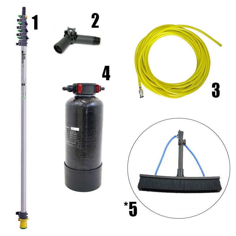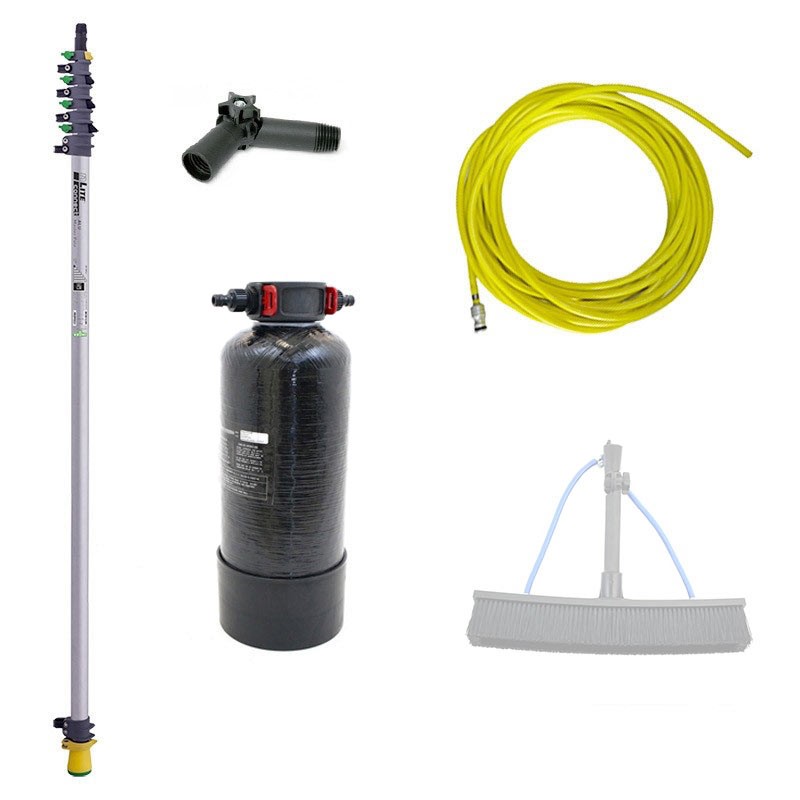 The POWER SOLAR kit is a compact solution for the professional cleaning of photovoltaic panels with deionized water , designed to ensure effective dirt removal without the use of detergents and without residue. The system integrates an ionic resin filter , telescopic pole , gooseneck adapter and 11 m rubber hose .