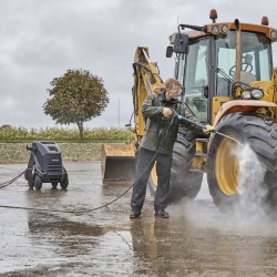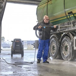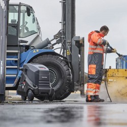 The Nilfisk 220 bar professional hot water pressure washer has a nominal power of 7.9 kW and integrates a patented 85 kW diesel/biodiesel boiler with a fuel consumption of 4.5 kg/h . The 30 L fuel tank ensures extended autonomy in industrial applications. The system also features a double 10 L detergent tank , optimizing continuous use in high-pressure industrial washing operations.