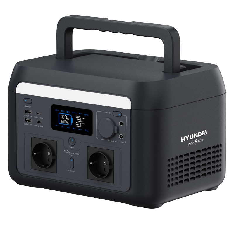 The Hyundai 6590 Thor 600 is a portable power station designed to provide energy anywhere, anytime. With its high storage capacity and multiple output options, it is ideal for camping , outdoor work , home emergencies and even for supporting campers and vehicles. With a 512 Wh LiFePO4 lithium battery, it guarantees over 3000 charging cycles , ensuring consistent performance over time.