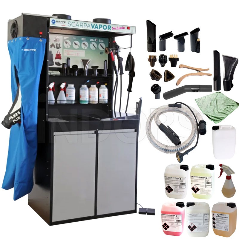 Bieffe Farinelli Scarpavapor No Limits BF426S is a Professional Steam Cleaner designed for the advanced cleaning of shoes, carpets, bags, car seats, helmets and complex textile surfaces . Its applications range from shoe care to the treatment of car interiors , up to the maintenance of sporting goods and leather accessories , offering an ideal level of performance for specialized laboratories, car beauty centers and professional cleaning businesses.