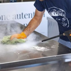 The Bieffe Farinelli BF4000 VACUUM steam generator has 2 steam outlets for use by two operators at the same time , it also combines the steam + hot water outlet + detergent injection functions in a single machine.