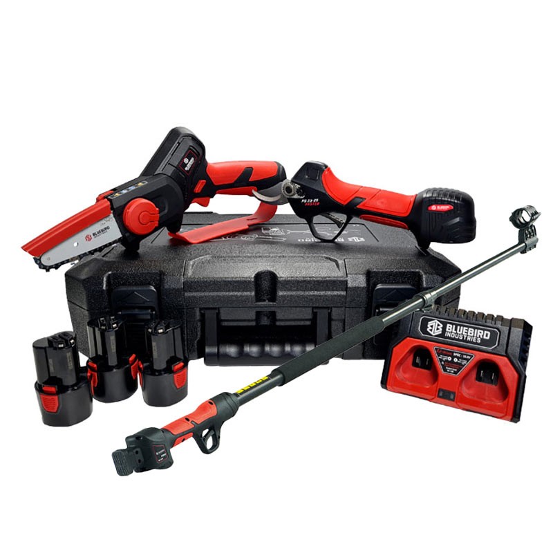 The Bluebird 889140 Pruner Kit works with 12.6V lithium batteries , including 3 units of 2.5 Ah , accompanied by a double charger to ensure continuous autonomy during use. The PS 23-25 FASTER pruner has a nominal voltage of 10.8V, with a maximum voltage of 12.6V , and a rapid charging time of between 2.5 and 4.5 hours , while the CS 22-04 pruner uses a 250 W brushless motor , ensuring superior power and duration for intensive work. The EP 22-22 extension cord , weighing just 1.2 kg without the battery, is designed to be perfectly compatible with the pruner and pruner in this kit, maintaining stability and balance even at maximum extension.