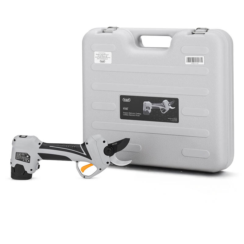 The low weight, just 0.81 kg without batteries , means these shears do not strain the operator, making work comfortable and safe thanks also to the ergonomic rubberized handle . Furthermore, the Volpi KV360 pruning shears are supplied with a hard case designed to organize and adequately protect all the elements.