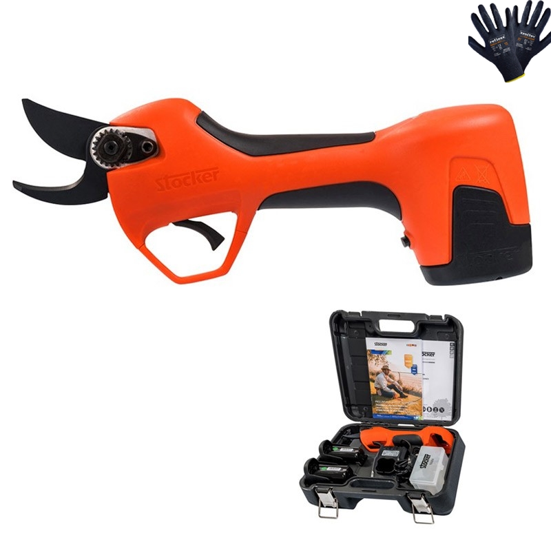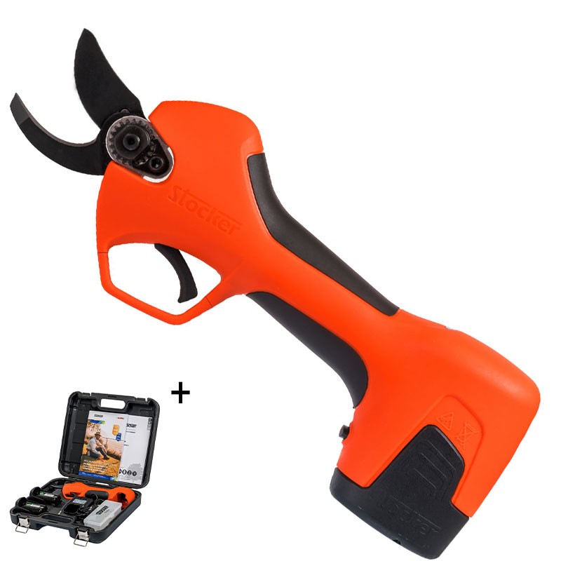 The Stocker Vulcano E-25 TR shears are light, fast and powerful , thanks to the 150 W brushless motor and the two 14.4 V rechargeable Li-Ion batteries supplied, which allow 4000 cuts . The automatic cutting mode allows you to prune quickly with minimal effort , the hyper-reactive magnetic trigger activates the blade with every press.