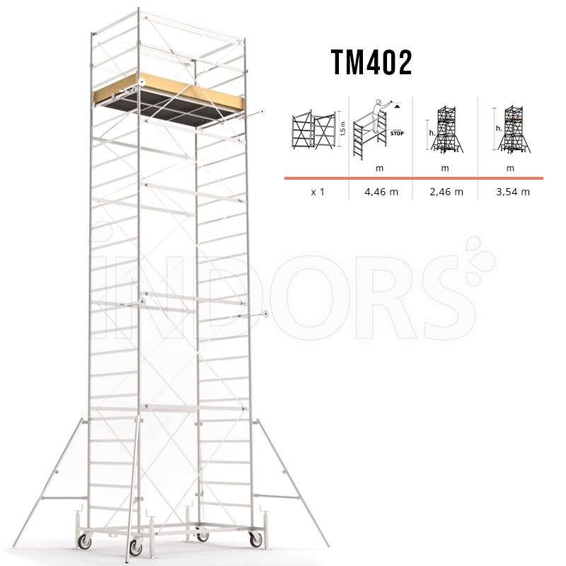 Mobile Towers Gierre Gigantissimo line with the possibility of adding a 0.9 m half span selectable from the drop-down menu. This range of Gierre Professional scaffolding is the most performing and is mainly characterized by its modularity , that is, the possibility of adding up to 18 risers to the basic module (TM402) thus bringing the maximum height of the platform from a minimum of 2.46 m to a maximum of 15.96 m (TM411).