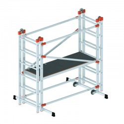 When closed, the multipurpose scaffolding is extremely compact , making it easy to transport on work vans and store in warehouses. Its low weight of 32.4 kg and optimized dimensions make it manageable even by a single operator, while maintaining high structural rigidity.