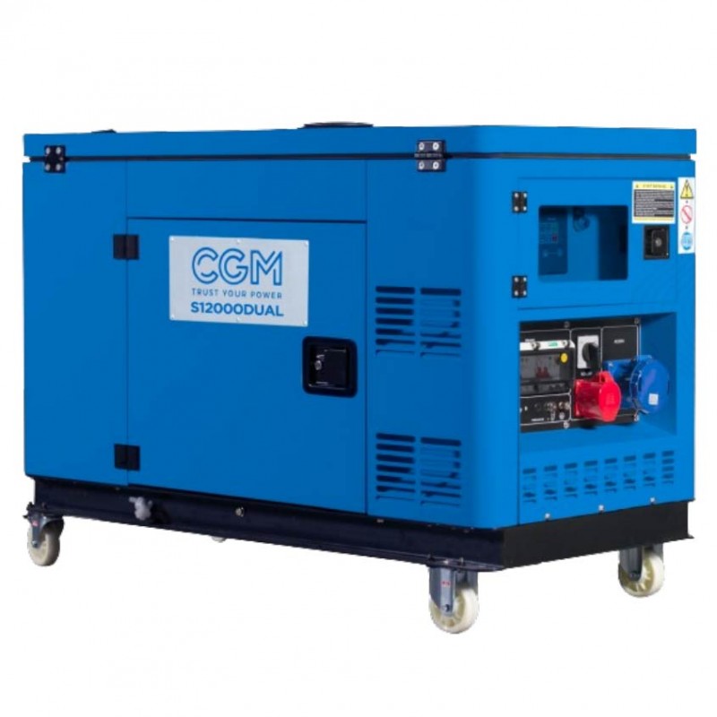 CGM S12000 DUAL soundproof generator set equipped with a CGM D16HP WATER COOLED water-cooled diesel engine and with electric starting system with 12 V battery, key and battery .