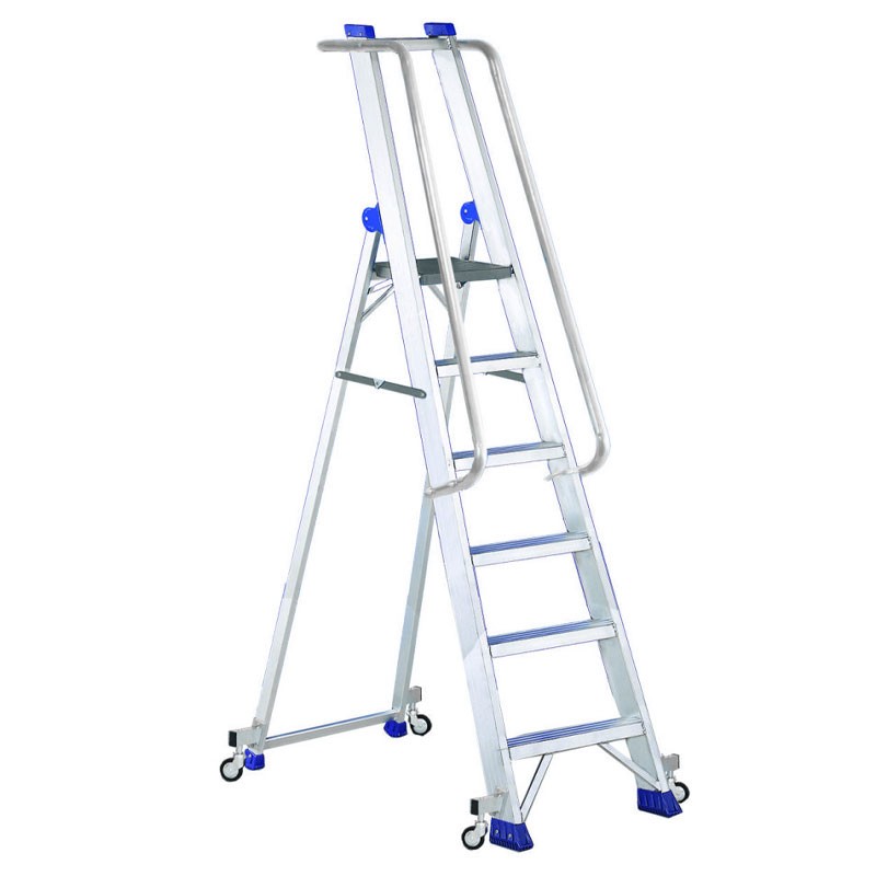 These Svelt Regina 4WD VIP ladders feature an aluminum guardrail designed to protect the user from falls caused by forward tilting. The guardrail allows the ladder to be used as the last step up to the platform. The included handrail also makes ascending and descending the ladder safe and secure.