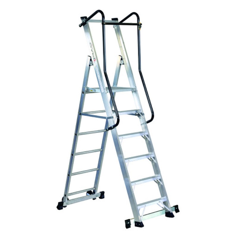 The Svelt Moby professional ladder features 80 cm guardrails on all four sides, 2 wheels with a diameter of 125 mm, painted handrails, a storage shelf, a 43 x 44 cm reinforced platform and a rear safety locking bar for stable locking and use in total protection.