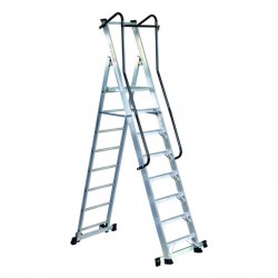 The Svelt Moby professional ladder features 80 cm guardrails on all four sides, 2 wheels with a diameter of 125 mm, painted handrails, a storage shelf, a 43 x 44 cm reinforced platform and a rear safety locking bar for stable locking and use in total protection.
