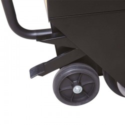 The Biemmedue One 650 STH sweeper features a sturdy metal rear collection bin, complete with a handle and transport wheels. This feature is easily accessible, making it easier to dispose of collected waste.