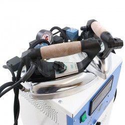 This steam generator has a footprint of 30 x 43 x 98 cm (WxDxH) and a weight of 22 kg , making it compact and easy to place in the work area.