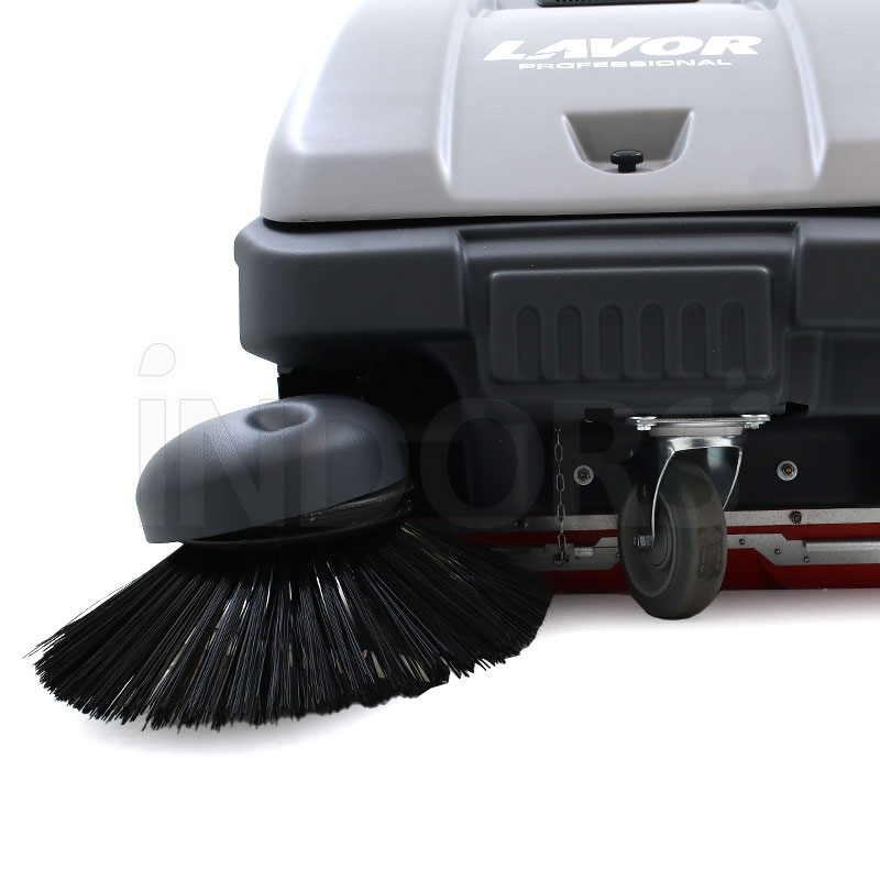 The Lavor SWL 700 features brush pressure adjustment and a quick-release main brush. This sweeper is equipped with long-lasting elastic belts; this Lavor sweeper features a foldable handle and a suction lever.