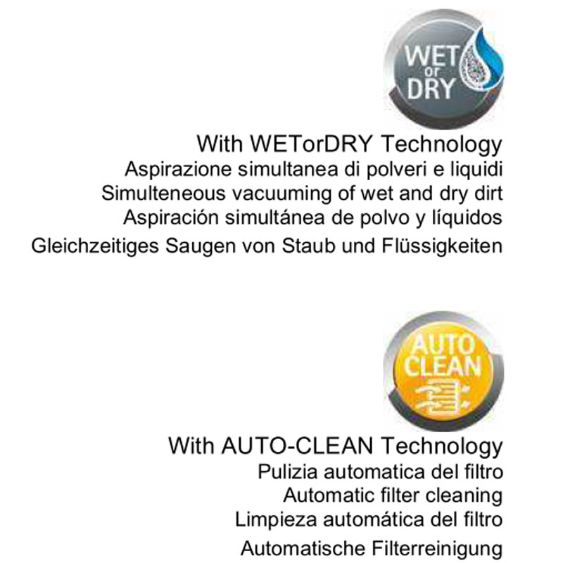 Wet or Dry technology allows for simultaneous vacuuming of dust, liquids, and solids without having to change the filter. The Auto-Clean system automatically cleans the self-cleaning cartridge filter, further reducing maintenance and ensuring consistent performance. Liquids are collected in the tank, while the air is purified first by a foam filter and then by the cartridge filter. A HEPA filter is also available upon request for even more effective filtration against fine dust.