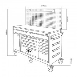 The JBM 54510 is constructed with a 1.0mm steel frame and 0.8mm steel drawers , powder-coated with a grained black finish for superior corrosion protection. The cart is equipped with six 5x2 inch TPR casters , including two locking swivel , two fixed and two adjustable , which ensure stability and maneuverability on any workshop surface. With a total weight of 158kg and a total capacity of 600kg , the cart offers an extremely robust and durable structure.