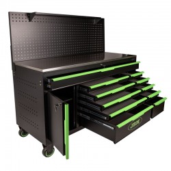 The JBM 54510 professional tool trolley is designed for intensive use in mechanical workshops , industrial maintenance departments , and technical laboratories . Made of high-strength steel , it offers a perfect balance between load capacity and ease of use, ensuring order and immediate accessibility to tools. Thanks to its 11 drawers with 45 mm self-return ball bearing slides , the JBM 54510 model ensures smooth sliding and maximum reliability even under heavy loads. The 25 mm stainless steel worktop increases its durability and resistance to impacts and chemicals, making it an ideal solution for professional settings.