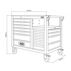 The JMB 54509 is a professional tool trolley designed for workshops and industrial environments that require organization and sturdiness. Made entirely of high-strength steel , it combines a solid structure with an 18 mm stainless steel worktop , ideal for supporting heavy tools and ensuring durability. With 7 front drawers and 4 side drawers , it offers ample storage capacity and a 45 mm ball bearing slide system with automatic return for quick and safe use.