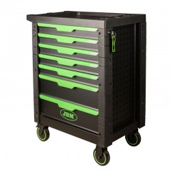 Operating features include seven drawers of varying sizes—five measuring 53.3 x 40 x 7.4 cm and two deeper ones measuring 53.3 x 40 x 15.3 cm —optimized for organizing a variety of tools. The JBM design ensures durability thanks to quality materials and construction designed for continuous professional use.