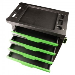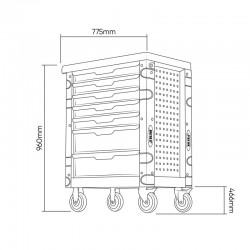 The JBM Series 489 trolley has overall dimensions of 77.5 x 46.6 x 96 cm , while with wheels the size reaches 75 x 51.5 x 99.7 cm , with 5" wheels, two fixed and two swivel, one of which has a brake. The structure is designed for a total load capacity of 300 kg , with each drawer capable of supporting up to 40 kg , while the upper tray supports loads up to 125 kg . The weight of the drawer unit is 55 kg , making the trolley stable but easily manoeuvrable in the workshop.