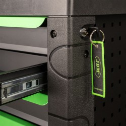 The cart is equipped with an internal safety locking system with a key , which protects the tools from accidental opening during transport. This feature is essential for professional and industrial environments where operator safety and tool protection are paramount.