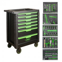 The JBM 489 Series 7-Drawer Tool Cart is a professional product designed for industrial workshops and laboratories that require organization and reliability in tool management. Equipped with 276 chrome-vanadium (CrV) steel tools , the cart combines strength and practicality thanks to the scratch-resistant coating and the ergonomic top tray with a load capacity of up to 125 kg , ideal for always having essential tools within reach. The modular structure with side storage area and internal safety key locking system ensures safety and advanced functionality even in the most intense work environments.